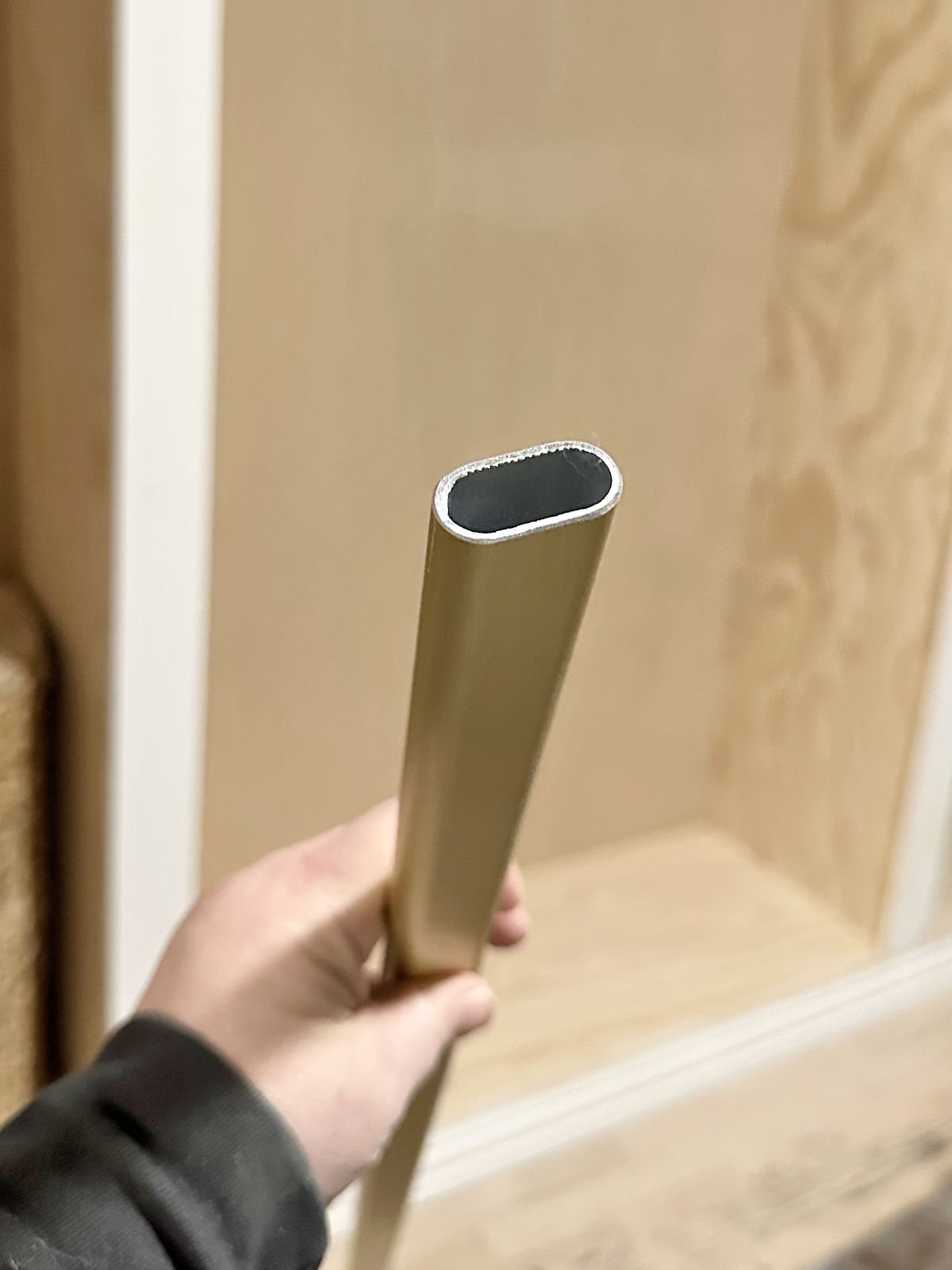My closet rods additionally arrived. I went with these oval shaped brushed gold closet rods (affiliate hyperlink), and so they’re lovely! These have nice buyer scores. I went with oval as a result of I believed the oval form may make them stronger and wouldn’t require middle helps (at the least, that made sense in my thoughts 😀 ).