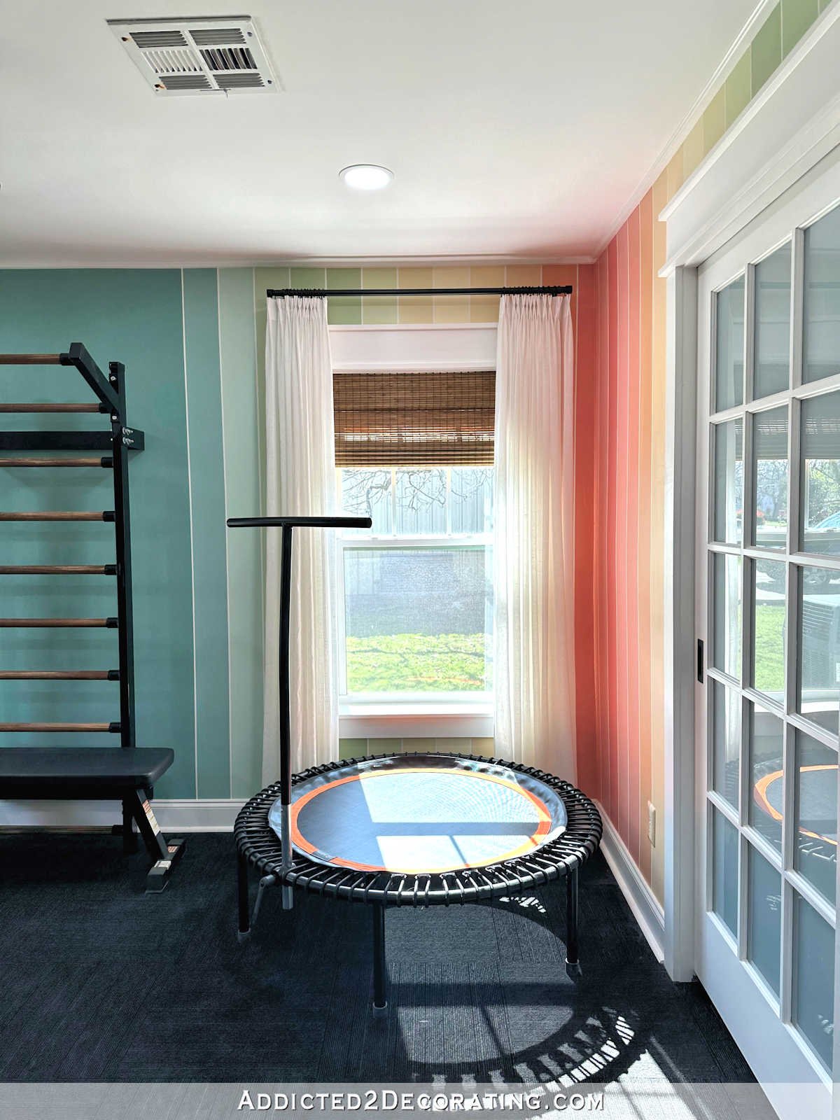 I moved the burden bench below the Swedish ladder. I could find yourself eliminating it altogether. It’s actually the one piece of apparatus that I hardly ever use. After which the treadmill is the place the rebounder was once.
