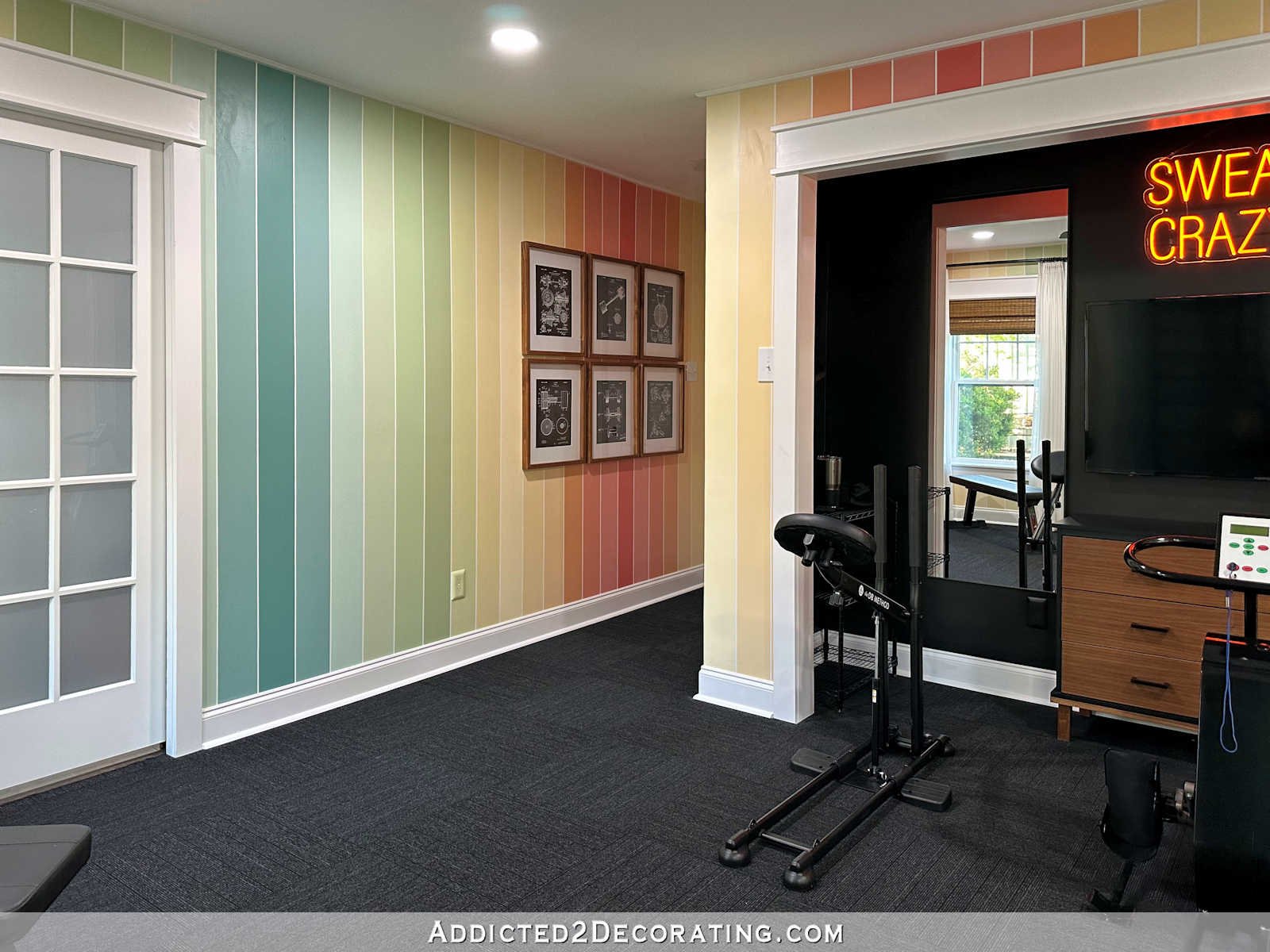 With my love of coloration and stripes, our striped home gym walls clearly should be included in my record. This venture was such a ache, as I needed to measure and tape off each single stripe with 1/4-inch tape, after which the tape didn’t come off cleanly, so I had to take action many repairs! It was an entire nightmare, however I’m so glad I persevered and didn’t name it quits. It’s so invigorating being on this room, surrounded by a lot coloration. In all, I used 15 totally different colours to color the stripes in right here.