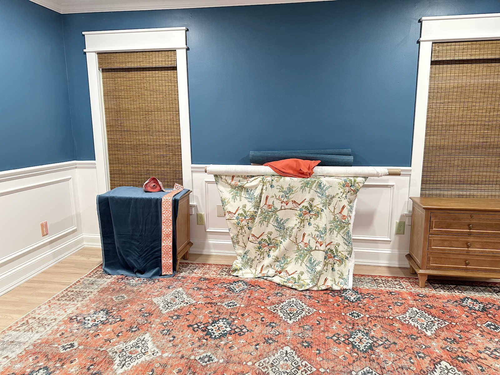 First, there’s the fowl material that I plan to make use of on the headboard (I feel — that’s one of many issues I’m questioning). On prime of that, you’ll be able to see the orange/coral material that I plan to make use of on the welt wire across the upholstered headboard. And on prime of that, you’ll be able to see the precise grasscloth wallpaper, which is a bit darker and richer in colour than the present wall colour. After which on the left is the material material and the trim that got here in yesterday.