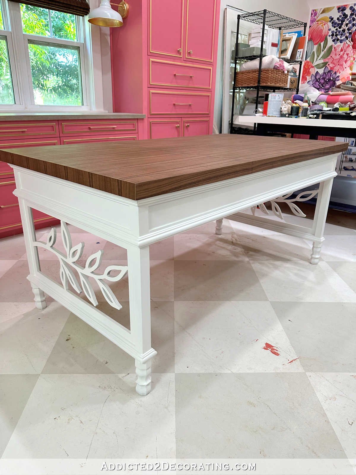 I’m so happy with how this desk turned out. I really like being within the kitchen and searching into the studio to see a glimpse of the desk, pendant gentle, and pink cupboards. Now I simply want my crimson velvet chair!