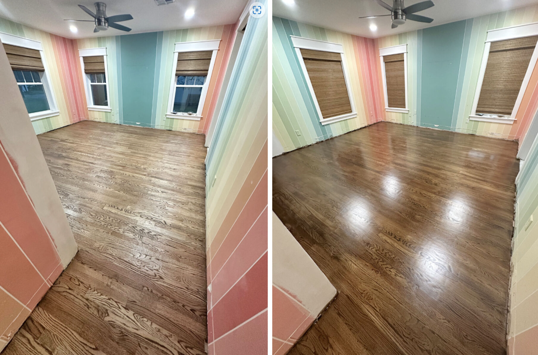 And right here’s a have a look at the side-by-side comparability of the flooring with simply the stain on the left, after which with two coats of the stain/polyurethane combination on the suitable.