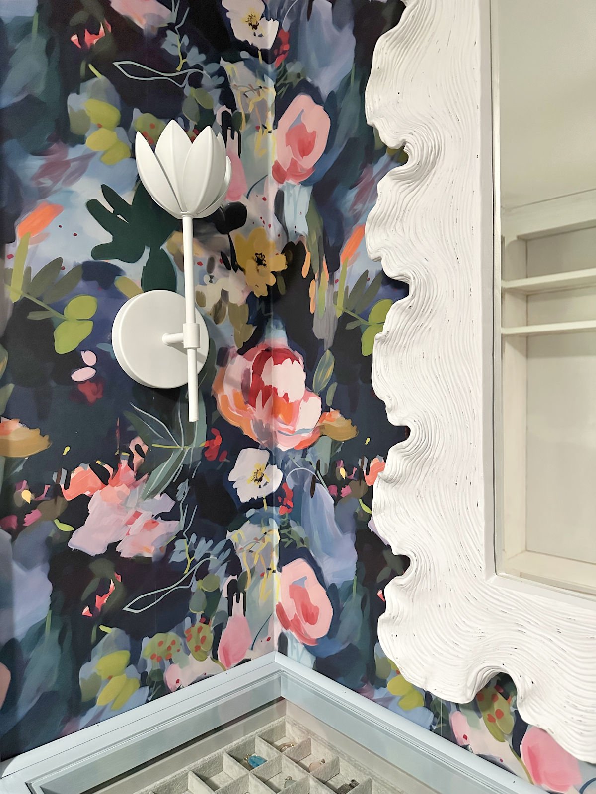 I used to be additionally a bit uncertain how the grey jewellery drawer would look as soon as all the things was completed. I had talked about in a earlier put up that I’d use a coral accent shade for the drawer. However in the long run, I’m very glad that I went with a lightweight grey in order that the drawer doesn’t draw an excessive amount of consideration away from the wallpaper and different fairly objects. I believe the grey labored out completely.