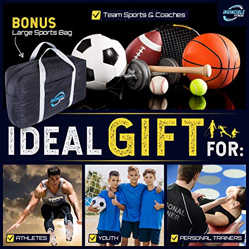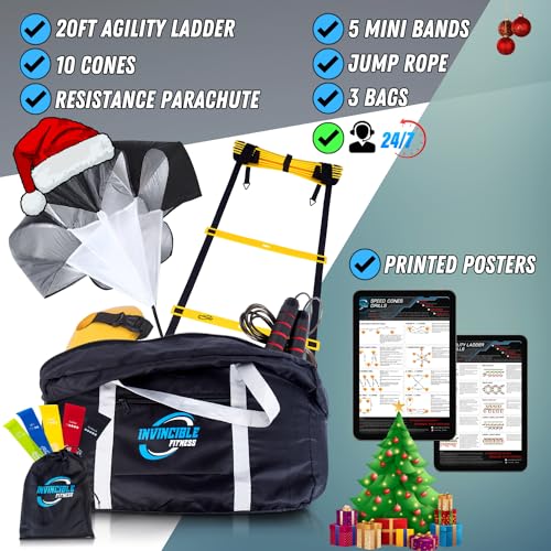 Invincible Fitness 20ft. Agility Ladder Set – Includes 10 Cones, 5 Loop Bands, 4 Hooks, Resistance Parachute, Jump Rope, & Carry Bag – Improves Power, Speed, Strength, Weight Loss & Physiotherapy