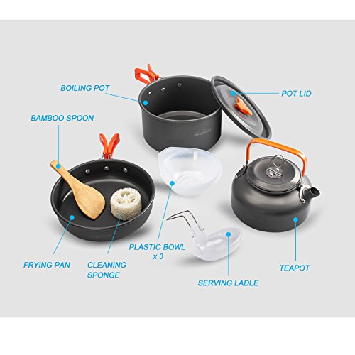Specification: OVERMONT 14 PCS Camping Cookware Outdoor Kitchen Set, Aluminum Portable Kettle Pots and Pans for Camping Hiking and Picnic for 1-3 Person