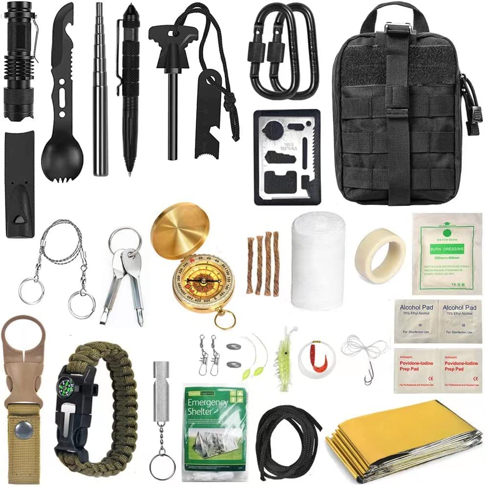 22 in 1 emergency survival kit can meet all the survival equipment needed for different outdoor survival. camping survival kit includes:Emergency sleeping bag,survival bracelet, wire saw, water bottle clip, emergency blanket, Fire Starter, blow fire tube , fire tinder,Tactical flashlight,Screwdriver,saber card, tactical pen,multi-use spoon fork,Carabiner,a whistle,compass,Fishing tools,Black Tactical Bag.the perfect survival kit to make your outdoor more worry-free